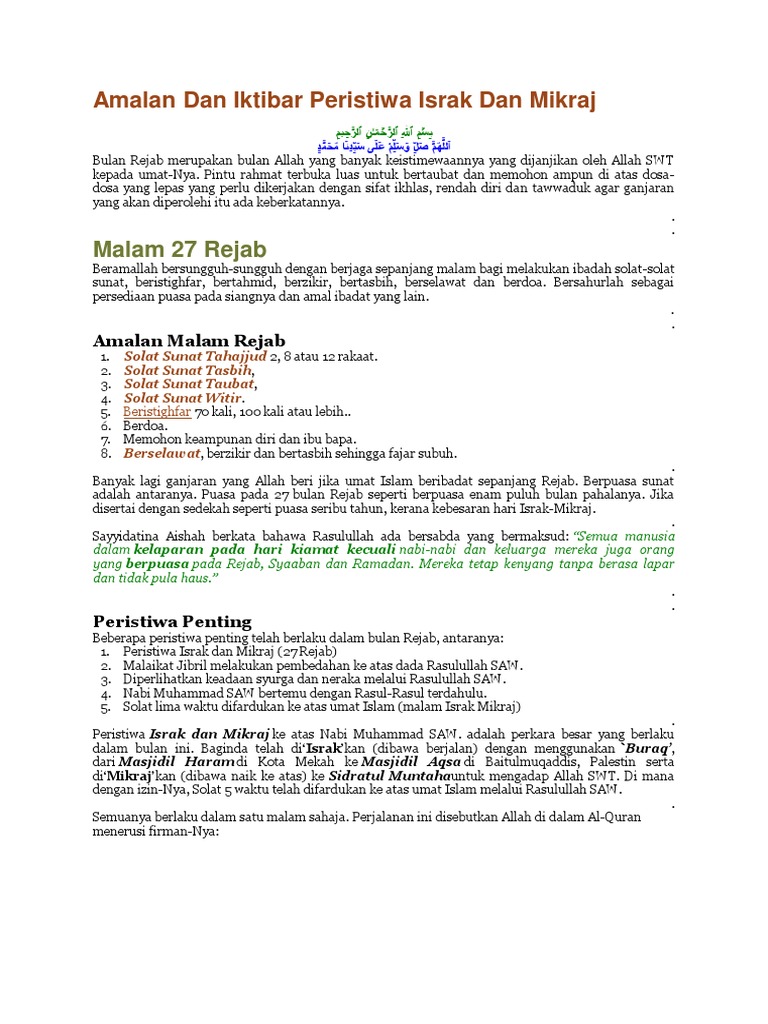 Banyak peristiwa yang Rasulullah alami sewaktu isra miraj. Amalan Dan Iktibar Peristiwa Israk Dan Mikraj Bulan Rejab merupakan bulan Allah yang banyak keistimewaannya yang dijanjikan oleh Allah SWT kepada umat-Nya. Menelusuri Perjalanan Israk dan Mikraj Secara Ringkas.